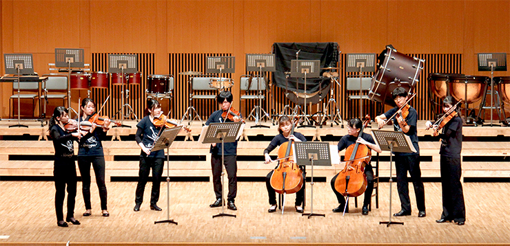 第1部で弦楽、オーボエ、フルート・ピアノ、トランペット・ピアノのアンサンブルと、音楽総合コース卒業生の編曲した作品(打楽器アンサンブル)を披露。