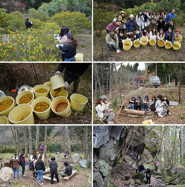 収穫後は田ノ口地区で、農村に人々を呼び込んで活性化を行う活動を展開している森のコミュニティレストランに移動し、クチナシご飯のカレーをごちそうになりました。また森林を散策して自然の豊かさを各自が体感すると同時に、農村地域を維持・存続させるための取り組みを詳しく学びました。