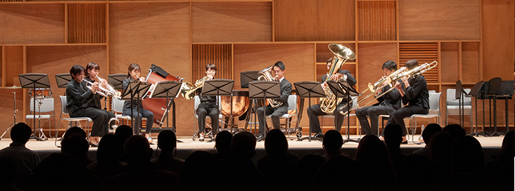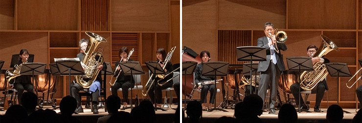 フリートロンボーン奏者の安部彰氏、九州を中心にユーフォニアム・チューバ奏者として活躍する上岡敏宏氏(本学非常勤講師)をゲストに招き、普段コンサートなどで聴く機会の少ないブラスアンサンブルに焦点を当てた8曲を演奏しました。