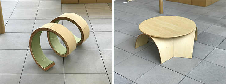 優秀賞を受賞した佐藤亜紀さんの作品はコイル状の椅子で、椅子を介した親子のつながりをカタチにしたものです。審査員からは、ユニークな椅子の形状とともに、実寸・実材で具現化する努力と情熱、加えてプレゼンテーションの手法が評価されました。