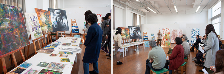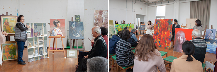 受講生は大きな絵画作品や立体作品など、それぞれ興味のある分野やモチーフに挑戦し、この講座で制作した作品はそれぞれが展覧会への出品や、アドバイスを元に完成へ向けて仕上げていきました。講評会では、モチーフへの思いや今後の課題などを発表し、中原准教授、永井准教授、前田非常勤講師がそれぞれの作品にアドバイスしました。