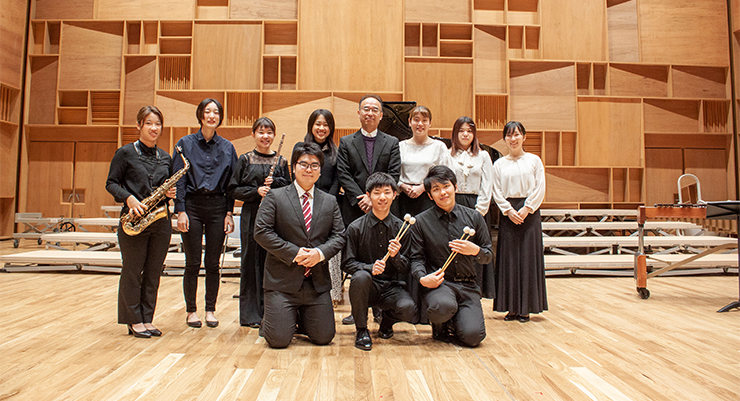 平成30年度よりスタートした音楽総合コースの作曲分野を履修する学生の卒業作品を発表する第1回目の演奏会で、2年間の集大成となる曲を、森口教授が指揮を執り、声楽・ピアノ・管弦打コースの学生9名が演奏しました。