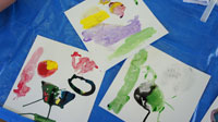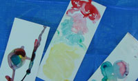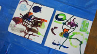 子どもたちは、絵の具がにじんで物の形にはらないことや、いろんな色を置いても思うような混ざり方にならないことで、「遊び」の感覚の中で集中して色の混ざり具合を楽しんでいました。
