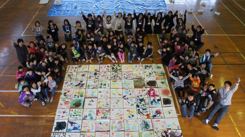 最後に、子どもたちの芸術作品を並べて学生といっしょに記念写真をパチリ。楽しい時間があっという間に過ぎました。また講座終了後は、子どもたちの給食に学生・教員も交じり、いっしょにワイワイとこの日の献立のカレーライスをいただき楽しく過ごしました。