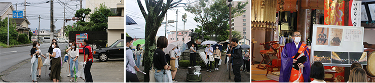 鶴崎商工会青年部の皆さんをはじめ、大分三好ヴァイセアドラーの選手・監督の皆さんと共に鶴崎地区内のゴミ拾いを行った後、加藤清正公を祀る法心寺の住職から寺の歴史について、また商工会議所において、鶴崎商店街の方々から商店街の歴史と新型コロナ禍での各店舗の取り組みや課題などについて話をお聞きしました。
