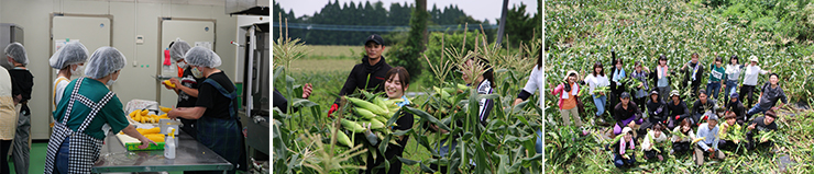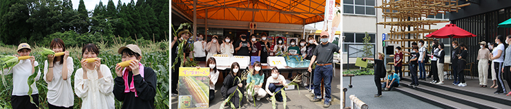 参加した学生の皆さんは朝8時半から3密を避けるために2つのグループに分かれて、とうもろこしの収穫支援と、とうもろこしを使った食品加工を行いました。食品加工では、蒸しトウモロコシ、焼きそば、おこわ、蒸し饅頭などを作り、自分たちで調理した商品を含めて販売支援を行い、道の駅すごうを訪問する多くの方にご購入頂きました。