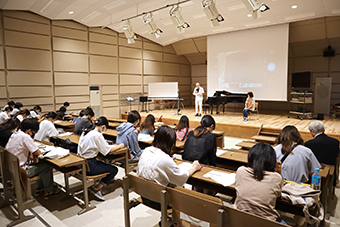 当日は急きょ東京二期会会員でソプラノ歌手の横山美奈(よこやまみな)氏がゲスト出演していただけることになり、歌曲を披露していただきました。学生は芸術文化に関するプロによる歌やトークを間近に触れ、刺激を受けている様子でした。