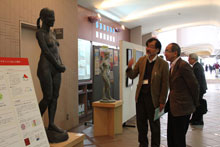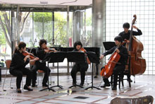 ランチタイムの後は「ミニ演奏会&ミニ展覧会」を開催。1Fエレベーターホールにて音楽科学生による弦楽五重奏やオペラを披露、学生たちの迫力ある演奏に大きな拍手を送られていました。また、美術科学生の作品を展示したコーナーでは、作品一つひとつに足をとめてご覧いただき、作品についての説明に耳を傾けておられました。短い時間でしたが、日頃の学習の成果を見ていただく、良い機会となりました。