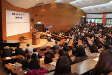 その後、大講義室にて広瀬知事による講演が行われました。テーマは『芸術文化短期大学生に期待すること』。広瀬知事は、芸術系と人文系が共に学べるという恵まれた環境にあることに触れ、「専門分野を究めて、ぜひ夢の実現に向けて頑張ってほしい」と学生らにエールを送られました。また、竹田キャンパスでの活動をはじめとする地域社会との繋がりや、常に世界に目を向けるグローバルな発想、若さの特権でもあるチャレンジ精神など、これからの人生に大切なことについてアドバイスされました。