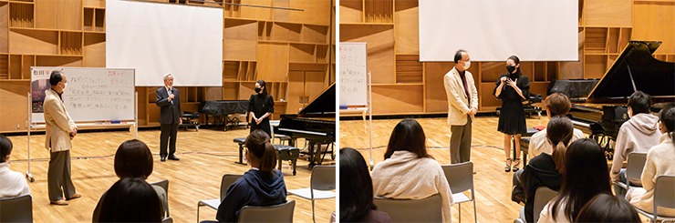 講義では「前奏曲集」作品28より第15曲「雨だれ」/ショパン、「楽興の時」第6番/ラフマニノフ を演奏し、モスクワ音楽院でのエピソードやロシアへ渡航を決断した時の心境、また生誕250周年になるベートーヴェンの曲についての見解など、さまざまな質問に答えていただきました。