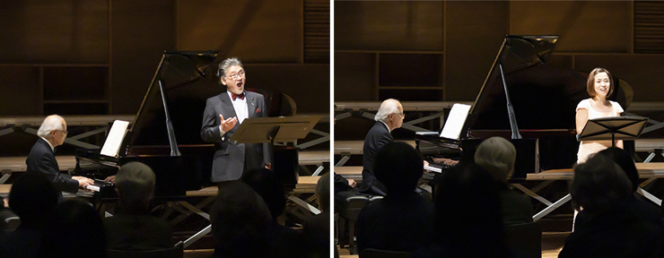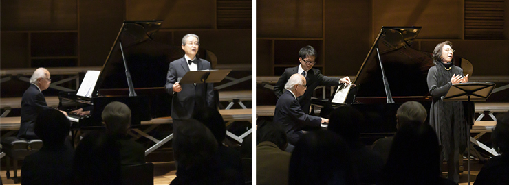 小林道夫客員教授のピアノ伴奏に乗せ、教員らが優雅に、時に力強く豊かな声をホール内に響かせ、観客を魅了しました。当日は日本語訳の歌詞パンフレットが配布され、来場者はピアノ演奏と歌の響きと共に、日本語訳で表現された詩を読みときながら、その情景を楽しみました。