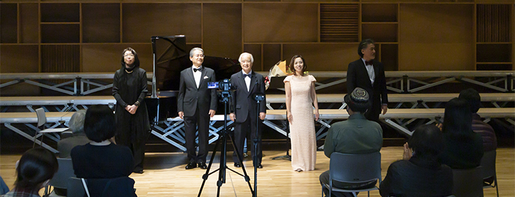 11月15日(日)、本学音楽ホールにおいて「ベートーヴェン歌曲の午後~小林道夫客員教授を迎えて~」を開催しました。小林道夫客員教授を迎え、愛甲久美教授(メゾソプラノ)、行天祥晃准教授(テノール)、林満理子准教授(ソプラノ)、宮本修名誉教授(バリトン)の本学声楽教員勢揃いによるベートーヴェン歌曲全28曲を披露しました。
