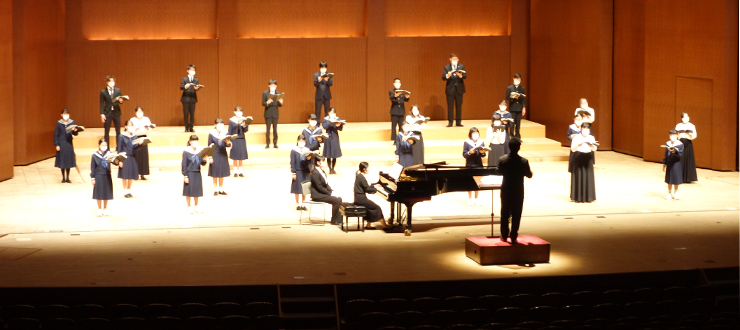大分県内の中高生42名が参加し、本学非常勤講師 新見 準平指揮のもと「Believe」「Welcome」「花は咲く」など9曲を披露。感染予防のため、生徒はリハーサル前日まで各自で練習を行い、発表では合唱者はマスクの着用、来場者も関係者のみと制限した中で行われました。