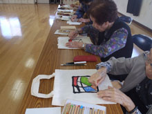 竹田市にある生きがいサロン玉来分館にて、おじいちゃん、おばあちゃんのエコバッグ作り体験を開催しました。みんな楽しく素敵なバックを作ってくれました。