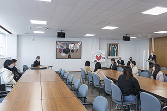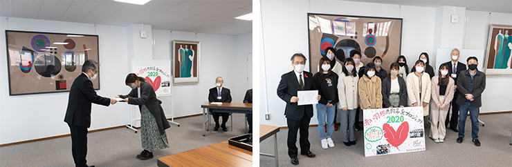 小手川学長から活動の経緯と活動内容を説明し、『赤い羽根応援プロジェクト』メンバー代表より、社会福祉法人大分県共同募金会へ目録が贈呈されました。