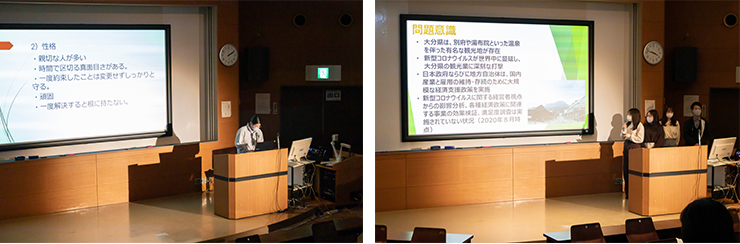 2年間の集大成である卒業論文の概要を、学生自ら創意工夫して発表。社会の仕組みや生活の中で興味・疑問に感じたことをテーマとして、アンケート調査や過去の事例の調査などを細かく実施したうえで、授業の中で携わった企画のPR手法、地域活性化に係る若年層へのアプローチ方法を用いて、学生の視点からの様々な研究成果を発表しました。