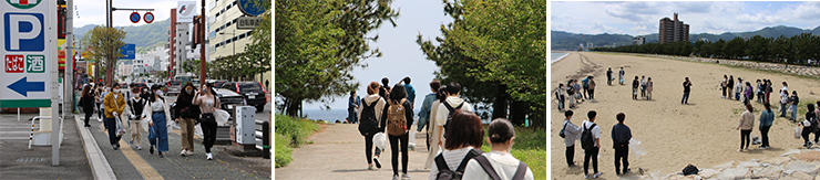 担当教員から活動の目的、別府市の特徴、観光の歴史、新型コロナウイルスがいま別府市に及ぼしている影響についての説明があり、街中から別府タワー付近にかけて歩道に落ちている空き缶などを、的ヶ浜公園から餅が浜公園にかけては、海岸沿いを中心に漂着ゴミの清掃をしました。