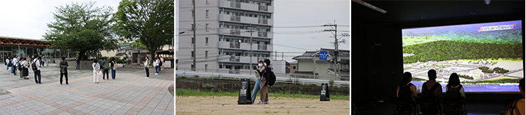 学生は周辺のごみを拾いながら、大学から南蛮BVNGO交流会館に行き、大友宗麟時代の歴史について学びました。ここではシアターや当時の戦国大名のなかでも最大級の大きさと優雅さを誇ったとされる庭園(2020年に再現)を見学し、スマートフォンを使ったVRツアーで当時の館の姿を学びました。また担当教員の綾部准教授から、当時の府内まちの特徴や南蛮貿易が日本にもたらした影響などについて説明がありました。