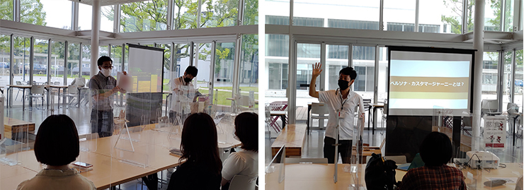 6月28日(月)、「創立60周年記念グッズ制作」第4回グループワークを行いました。 前半は西口准教授指導のもと、提出案を基にブラッシュアップされたデザインのチェックと商品化する案の選別を行い、後半は千賀講師指導のもと、「カスタマージャーニー(消費行動)」のグループワークを行いました。