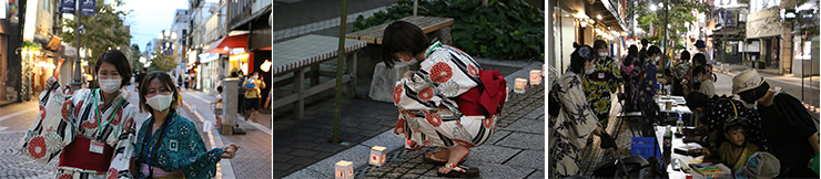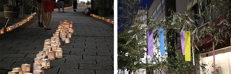 夕方5時から、予め市内の保育園、幼稚園、こども園の子供たちに絵を描いていただいた1,200個のキャンドルを五番街の通りに並べて灯しました。また、短冊作成コーナーを設け、たくさんの方に願い事を書いていただき、沿道に飾られた竹に結びつけられました。