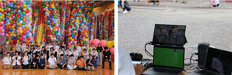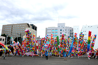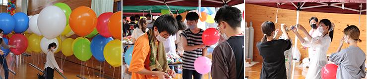 朝9時から旧荷揚町小学校体育館で風船にヘリウムガスを入れる作業を開始しました。新型コロナ感染拡大防止のため、少人数毎のグループに分かれ、休憩を入れながら、窓や扉は全開にし、大型扇風機で強制換気をしながらの作業となりました。