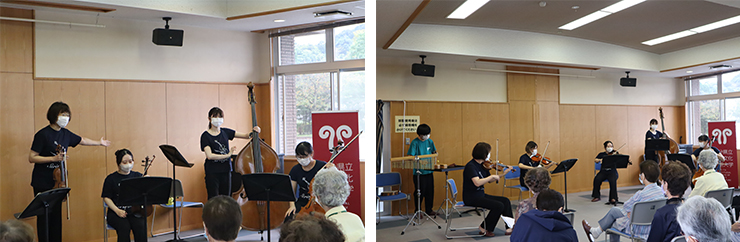 9月15日(水)、佐伯市の渡町台公民館で、音楽科 川瀬教授と、管弦打コース学生など6名による弦楽器・打楽器のアンサンブルコンサートを開催しました。