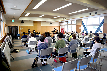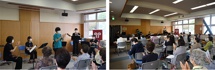 当日参加した渡町台高齢者学級の学級生や地域住民の方々に、親しみ深い秋にまつわる童謡や荒城の月、上を向いて歩こうなどを選曲し、楽器説明や曲目紹介などを交えながら演奏を楽しんでいただきました。