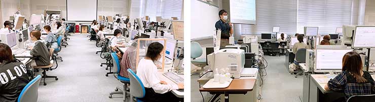 10月1日(金)の「情報リテラシーⅡ」の授業で知的財産検索講座を行いました。 特許業務法人藤本パートナーズ副所長 野村 慎一 弁理士を講師にお招きし、「J-PlatPat(特許情報プラットフォーム)」を使用した、意匠、商標、特許・実用新案の検索手法について演習しました。また、実際に意匠登録されている物品を検索しながら、デザインを保護するための意匠制度についてもご講演いただきました。