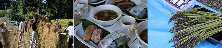 今回は、「ちよみ自然農園」で、古代米の掛け干しを体験しました。掛け干しは、刈りとった稲を適度な乾燥状態に保ち、栄養を穂先に集める昔から伝わる農法です。自然農法や古代米の特徴などについて説明を受け、慣れない手つきながら作業を行いました。収穫後、農家の方がふるまってくださった手作りの食事を秋空の下、おいしくいただきました。