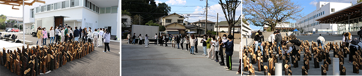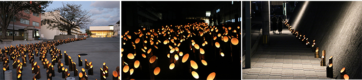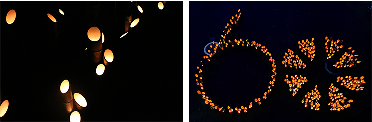 当日は風が強く着火作業に難航しましたが、天候も良く、参加した学生の皆さんの努力により、美しい竹灯篭のデザインが完成しました。