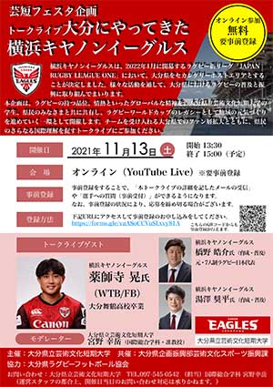 11月13日(土)、オンラインにて芸短フェスタ企画「トークライブ大分にやってきた横浜キヤノンイーグルス」を開催します!