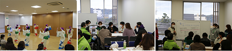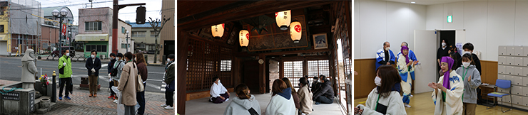 3つのグループに分かれて、鶴崎商工青年部の皆さんとまちのなかを歩きながら清掃し、鶴崎の3大祭りである「清正公二十三夜祭」「八幡宮けんか祭」「鶴崎踊り」について、専門ガイドの方々から詳しく説明を受けました。鶴崎支所では国の無形民俗文化財に指定されている「鶴崎踊り」の実演を見学し、学生達も踊ってみました。