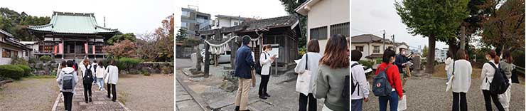 芸文短大正門にある大分高等商業学校記念碑群から、大臣塚古墳、元町石仏、高良神社など大学周辺に点在する史跡のうち12カ所を巡り、ゼミ受講者10名が各地の歴史や名前の云われ等、事前に図書館や現地へ赴いて調査した成果をそれぞれ発表しました。