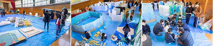 会場では、「スイスイ!!海の底をスタンプラリー」をテーマに、学生が5つのグループに分かれ、大きなダンボールや和紙、ビニール紐など様々な材料で、巨大迷路の土台や飾りつけのための道具を準備し、児童を迎えました。