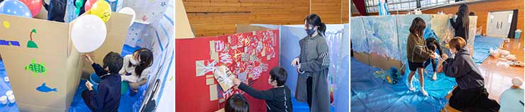 制作後は、完成した全ての迷路をめぐるスタンプラリーを開催。児童たちは海の中を潜っているかのように、歓声を上げながら探検し、スタンプラリー満点を目指して楽しみました。