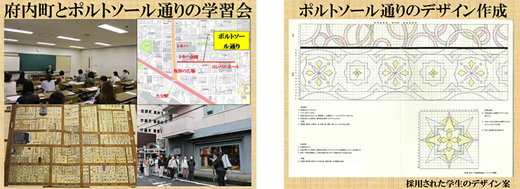 サービスラーニングの一環として昨年取り組んだポルトソール通り(府内11号線)のデザイン・プロジェクトで本学学生のデザイン案が採択され、工事が着々と進んでいます。この通りは、大分市中心部のトキハ百貨店の裏手にある東西400メートルの通りで、府内町とポルトガルとの交流の歴史にちなんで名づけられたものです(ポルトソールは、ポルトガル語で夕暮れ時という意味)。
