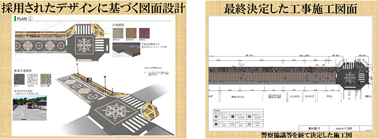 参加した学生らは、通りの車道、歩道、交差点部分のデザインのために、通りや地域の歴史や将来への期待などについて地元の方々から聞き取り、また実際にまち歩きをしながら特徴を把握し、各々デザイン案を作成しました。
