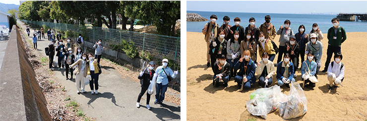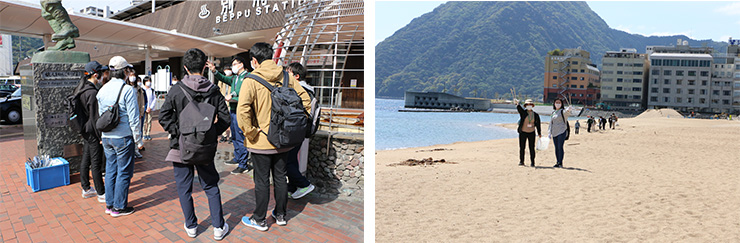 担当教員から別府市の特徴、観光の状況などについて説明した後、街の様子を観察しながら別府駅から別府タワーにかけて歩道に落ちている空き缶などを拾いました。続いて、的ヶ浜公園から餅が浜公園にかけての海岸沿いを清掃しました。海岸では、マイクロプラスチック問題などに関する説明もありました。