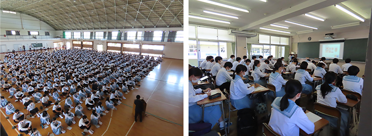 事前に希望のあったSNSの危険性や犯罪行為等について、『SNSの利用と違法行為』と題し、各種法律や情報モラルの考え方について講演が行われ、1年生と3年生は体育館で、2年生はリモートで聴講しました。