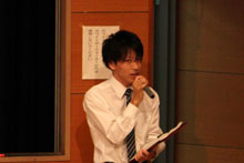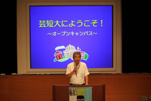 学友会副会長の矢野功大さん司会のもと進められた全体説明会では、中山欽吾学長が本学のキャッチフレーズである「小粒でもキラキラ輝く宝石のような存在になろう」の合言葉とともに本学の魅力と大学生活を送る上での心構えを述べられたあと、「市街地に近い上に緑が多いキャンパスはめったにありません。自然あふれる中で、しっかりと学べる環境にあるのが魅力です。小さい大学ですが、いろいろと学ぶチャンスがたくさんあります。今日は学内に先生たちをはじめ、先輩たちも案内でいますので、じっくり見て・聞いて芸文短大の魅力を知ってもらい、「今日は来て良かった!」と思ってもらいたいと思います」と話されました。