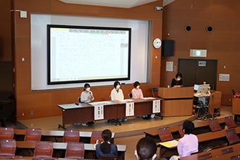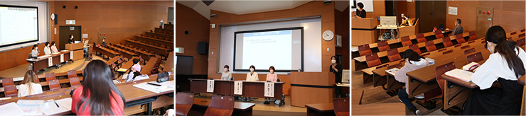 また、専攻科音楽専攻、国際総合学科、情報コミュニケーション学科より早期に内定の決まった3名をお招きし、対談形式で就職活動を始めた時期や、自分に合った企業の探し方、自己分析や自己PRの書き方、勉強との両立方法、進路支援室をどうやって活用してきたかなど、学科の特性等を踏まえ様々な視点で就活体験談を教えていただきました。