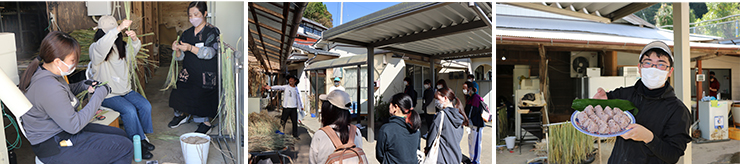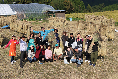 そこで昨年度に続き、同市にある「ちよみ自然農園」において、古代米の収穫および掛け干しの支援を行いました。掛け干しは昔から伝わる伝統農法で、稲を適度な乾燥状態に保ち、栄養を穂先に集めることを目的に行われています。また実際に農家でとれた古代米、もち米、麦、雑穀などを使って、おにぎり、お餅、漬物や大分の伝統料理であるだんご汁などを自分たちで調理し、実際に試食しました。
