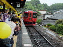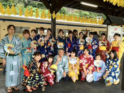 運転再開イベントには芸文短大生36名が参加、豊後竹田駅10:25着の九州横断特急大分行き(熊本8:35発)の豊後竹田駅到着時には浴衣でお出迎えしました。