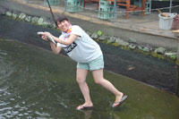 また、町歩きをしてフェイスブックに投稿した。今回私たちだけで(3人1グル-プ)竹田の町を取材した。醤油ソフトお店と但馬饅頭がおいしいお店をまわった。醤油ソフトは想像していたより甘くて塩っぽくなく、キャラメルぽかった。ちなみに、道の駅とかに醤油や調味料はおいてあるけど、醤油ソフトは置いていないので、あのお店でしかたべられないらしい。但馬饅頭は初めて食べた。しかも焼き立てを食べることができた。また後半は、ゼミだけでの行動となった。川魚をつかみどりしたり、取れたてを捌く経験をさせてもらったり、取れたてを食べたりした。先輩たちとの行動になり少し緊張していたけど、親しみやすい先輩たちでホッとした。竹田の地元の人たちや全線復旧祝いに来ている人たちと話しをした。また、後半からはゼミの先輩たち、竹田を盛り上げようとしている人たち、“たけたみつけた”を作った先輩など様々な人たちが集まって豪勢な晩御飯を食べ、話をした。今回はふんわりした感じのお食事会で顔合わせのかねた話し合いだったような気がする。