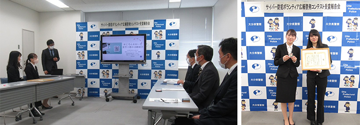 情報コミュニケーション学科野田研究室の黒木さんと横松さんが制作した動画作品が、警察庁サイバー防犯ボランティア広報啓発コンテストで局長賞(最優秀作品)に選ばれ、表彰された件について、3月23日、大分県警察本部で受賞報告会が行われました。