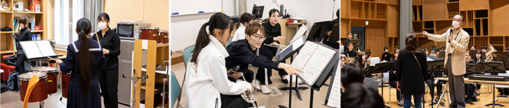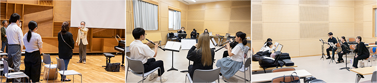 講座では、打楽器、クラリネット、ホルン、オーボエ、トランペット、指揮法・楽曲に分かれ、パート別に希望する課題曲を練習。専門的な音の出し方、表現の仕方、大半の中学生・高校生がつまずいてしまう箇所のアドバイスを清水万敬教授と髙田喜夫准教授、各楽器を演奏する学生が説明し、解決策を見出していました。