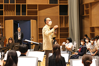 また、森口真司教授と本学吹奏楽団による課題曲演奏公開リハーサルが行われ、それをお手本に、受講者が自由に自分の考えで指揮を振りました。