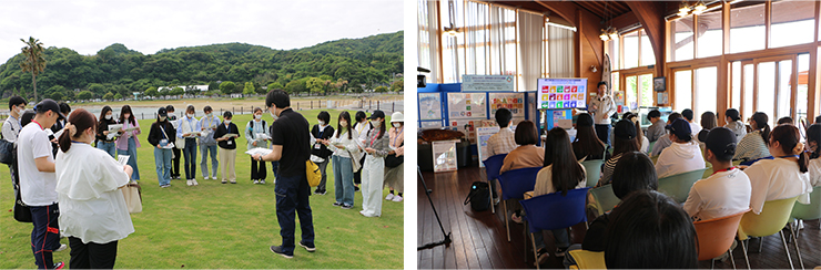 活動では、最初に担当教員の藤原講師から田ノ浦ビーチの概要や大分市の観光について説明を行い、田ノ浦ビーチを散策しました。その後、NPO法人おおいた環境保全フォーラムが主催する「エココーストプロジェクト”2023”」に参加しました。このイベントでは、田ノ浦ビーチの清掃活動を行った後に、日本文理大学の方たちから環境保全に関するお話を伺いました。