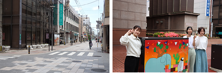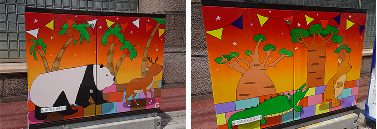 このプロジェクトの一環として、情報コミュニケーション学科の学生が、同通りのトキハ会館横と大分センチュリーホテル前にある地上機器(電線地中化に伴い設置される変圧器などの電気設備)のデザインに取り組み、この度、4基の地上機器にデザインが描かれ、公開されました。