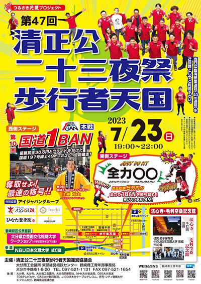 「国道1BAN」は、鶴崎二十三夜祭の恒例イベントで、武将である加藤清正公が享年49歳、7月23日が命日であったことにちなんで、49.723mの短距離を、スピードを争って競う競技です。